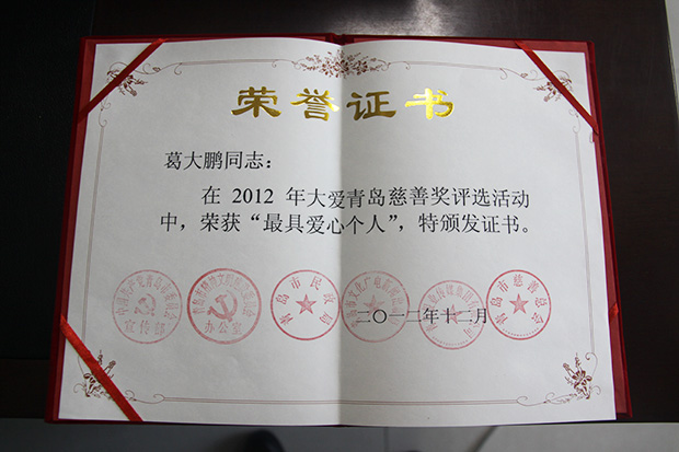 12月30日晚,青島市慈善總會2013年慈心童行元旦慈善晚宴在黃島飯店舉行。會上對2012年度“大愛青島慈善獎”評出的在助醫(yī)、助學(xué)、安老、慈孤、賑災(zāi)、義工服務(wù)等方面,做出突出貢獻(xiàn)的27個集體和50名愛心個人進(jìn)行了表彰。海利爾藥業(yè)集團(tuán)副總裁葛大鵬榮獲“最具愛心個人”榮耀稱號。????????