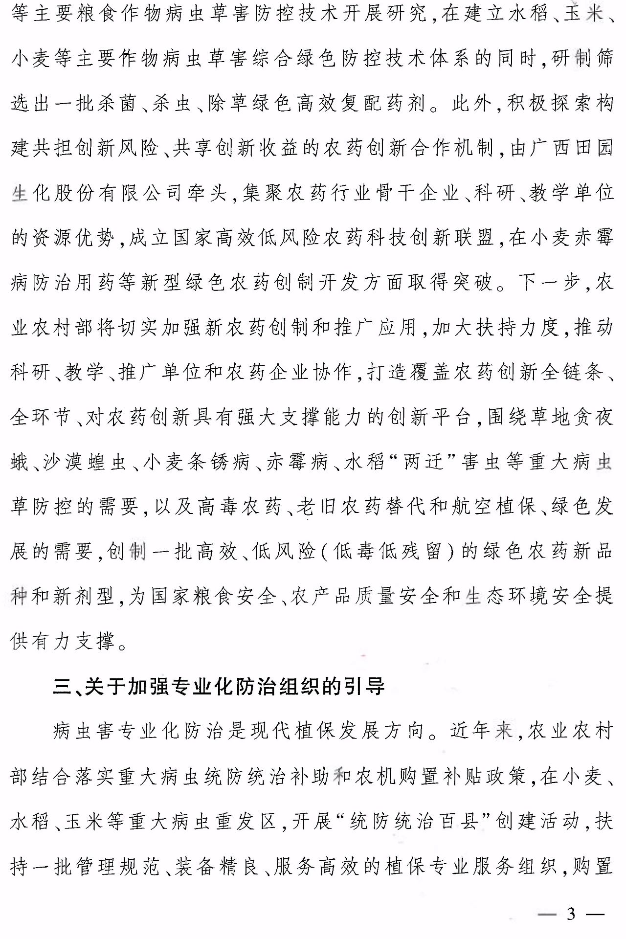 ? 創(chuàng)新驅(qū)動(dòng)是做大做強(qiáng)農(nóng)藥產(chǎn)業(yè)的內(nèi)在動(dòng)力。近年來(lái),農(nóng)業(yè)農(nóng)村部高度重視農(nóng)藥新產(chǎn)品創(chuàng)制及推廣應(yīng)用,不斷加大農(nóng)藥研發(fā)投入,中央財(cái)政每年安排1680萬(wàn)元,在現(xiàn)代農(nóng)業(yè)產(chǎn)業(yè)技術(shù)體系設(shè)立病蟲(chóng)草害防控功能研究室,聘用24名專(zhuān)家,圍繞水稻、玉米、小麥等主要糧食作物病蟲(chóng)草害防控技術(shù)開(kāi)展研究,在建立水稻、玉米、小麥等主要作物病蟲(chóng)草害綜合綠色防控技術(shù)體系的同時(shí),研制篩選出一批殺菌、殺蟲(chóng)、除草綠色高效復(fù)配藥劑。