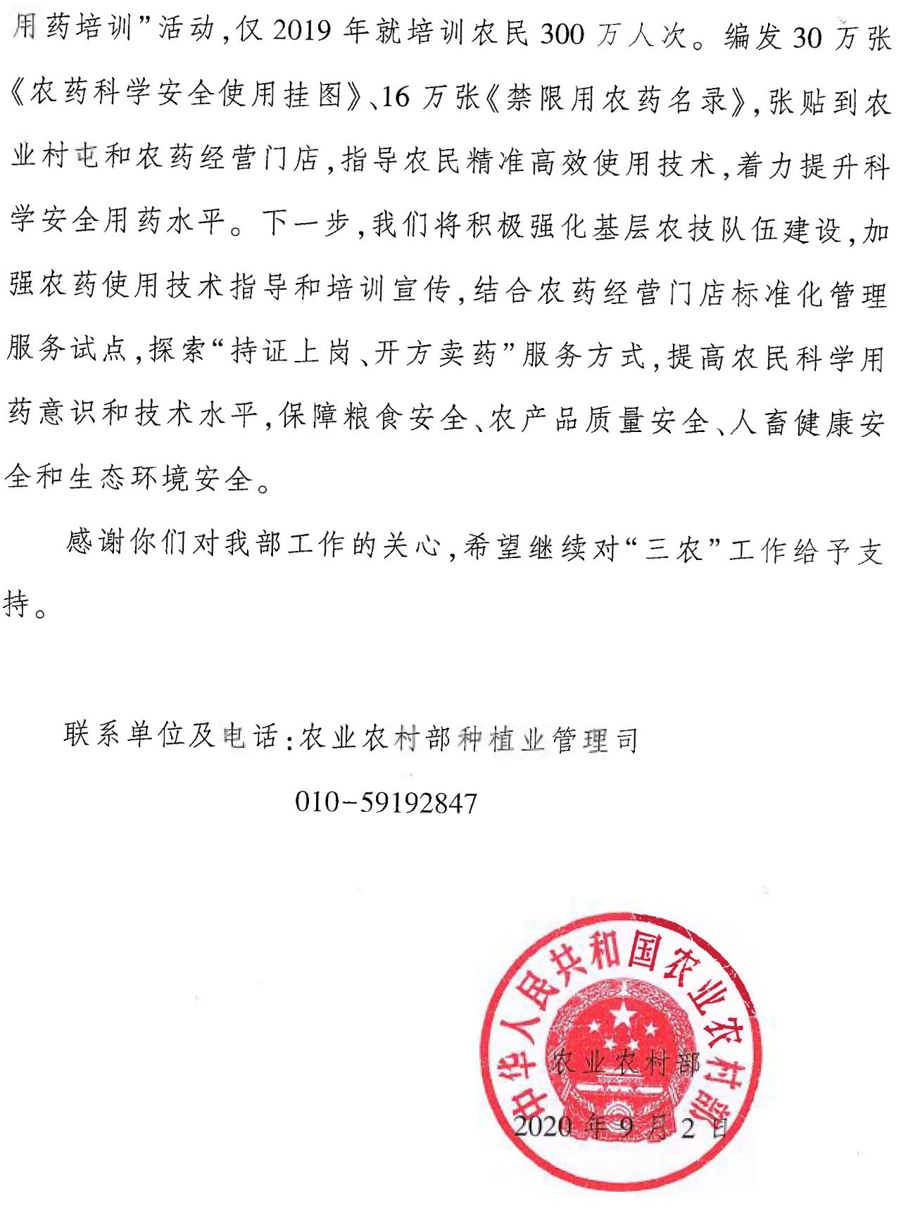 ? 同時(shí),農(nóng)業(yè)農(nóng)村部加強(qiáng)科學(xué)安全用藥技術(shù)培訓(xùn)和指導(dǎo),從2012年開(kāi)始,在全國(guó)組織開(kāi)展“百萬(wàn)農(nóng)民科學(xué)安全用藥培訓(xùn)”活動(dòng),僅2019年就培訓(xùn)農(nóng)民300萬(wàn)人次。編發(fā)30萬(wàn)張《農(nóng)藥科學(xué)安全使用掛圖》、16萬(wàn)張《禁限用農(nóng)藥名錄》,張貼到農(nóng)業(yè)村屯和農(nóng)藥經(jīng)營(yíng)門(mén)店,指導(dǎo)農(nóng)民精準(zhǔn)高效使用技術(shù),著力提升科學(xué)安全用藥水平。