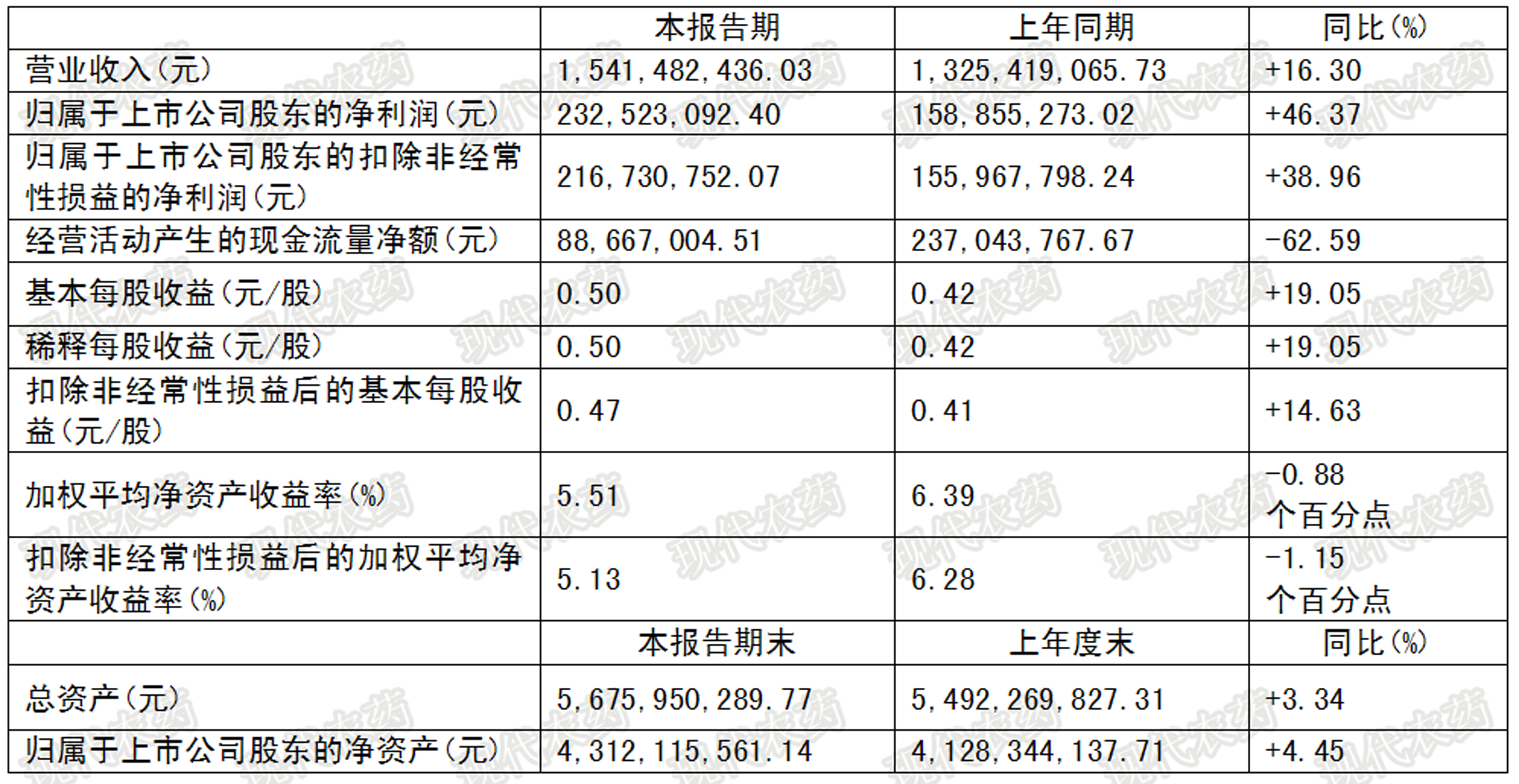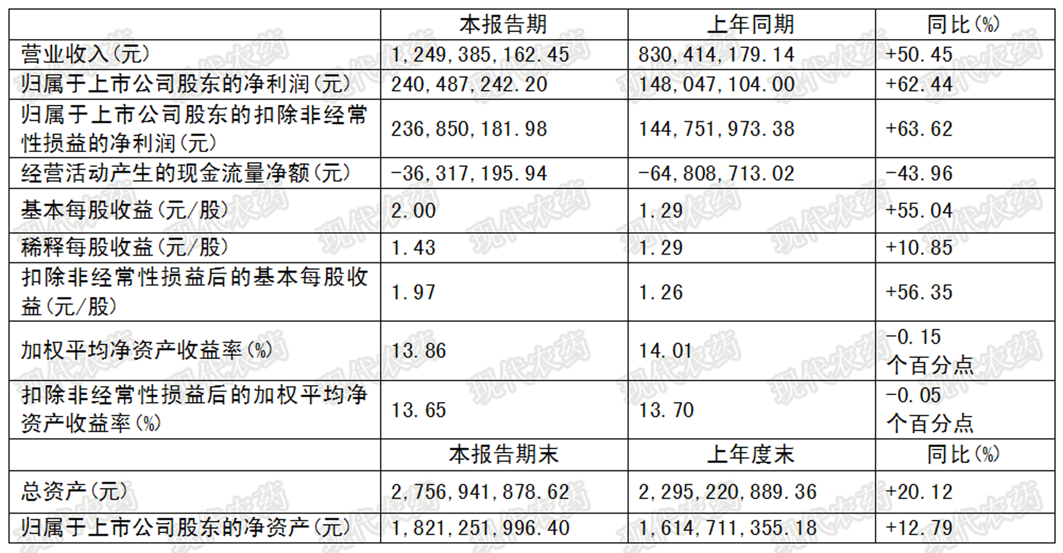??? 報告期內,公司實現合并營業收入124,938.51萬元,同比增長50.45%;實現歸屬于上市公司股東的凈利潤24,048.72萬元,同比增長62.44%。在此期間,公司取得高新技術企業證書;同時,公司自籌資金新建煙堿類殺蟲劑項目開工建設。