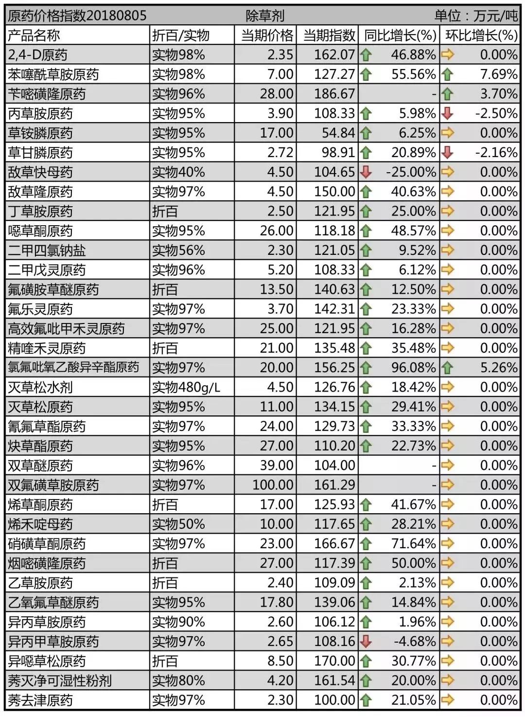同比去年,異丙甲草胺原藥、敵草快母藥下跌,其余品種均上漲。
