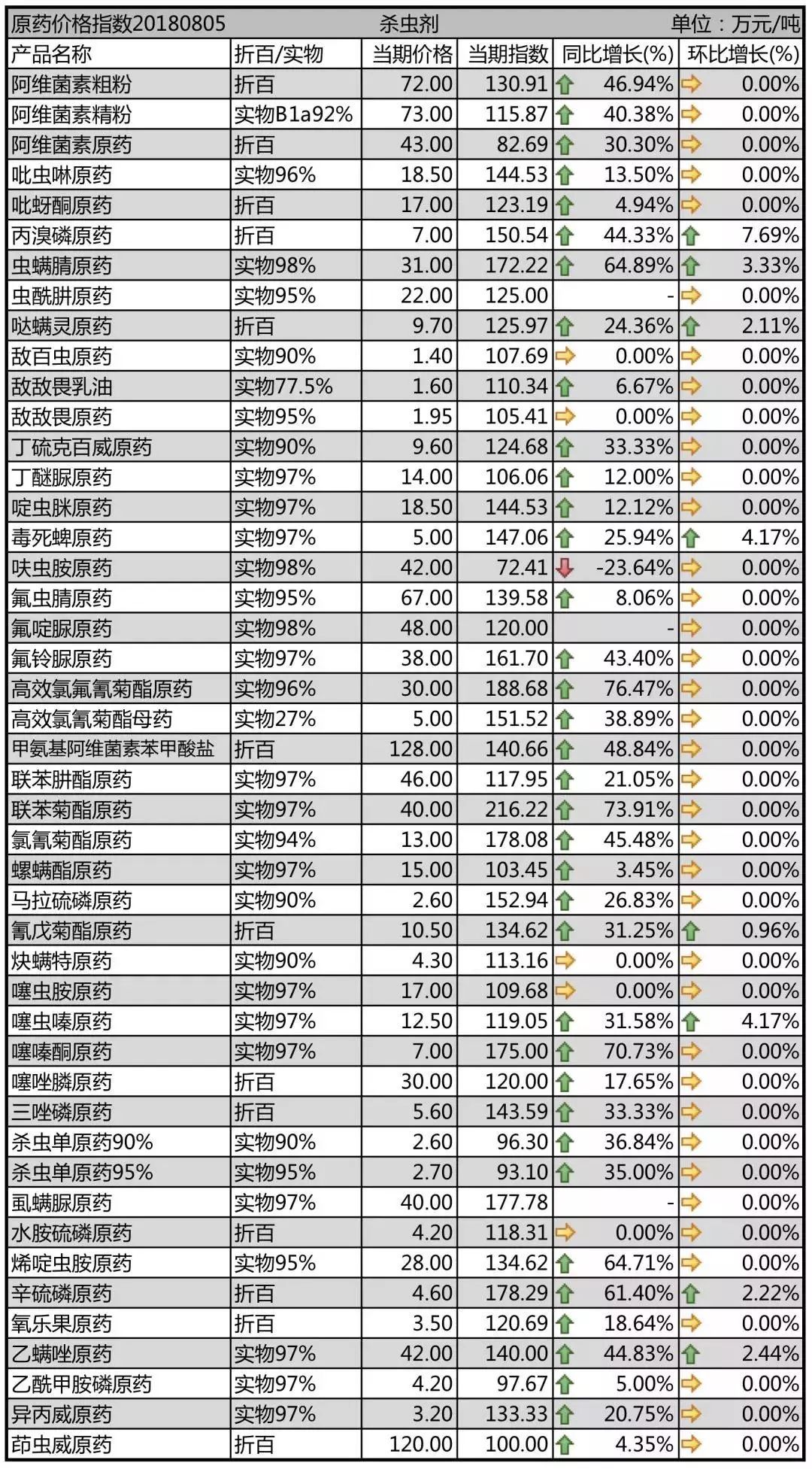 同比去年,呋蟲胺原藥下跌,敵百蟲原藥、敵敵畏原藥、炔螨特原藥、噻蟲胺原藥、水胺硫磷原藥等持平,其余品種均上漲。