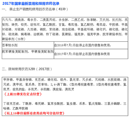 ??? 也就是說只有獲得定點經營資格的農藥經營點才可以銷售以上農藥,不過根據農業農村部2017年出臺的《限制使用農藥名錄(2017版)》,里面標注的限制使用農藥共有32種,其中就包括目前使用量較大的毒死蜱、丁硫克百威、樂果這些產品。