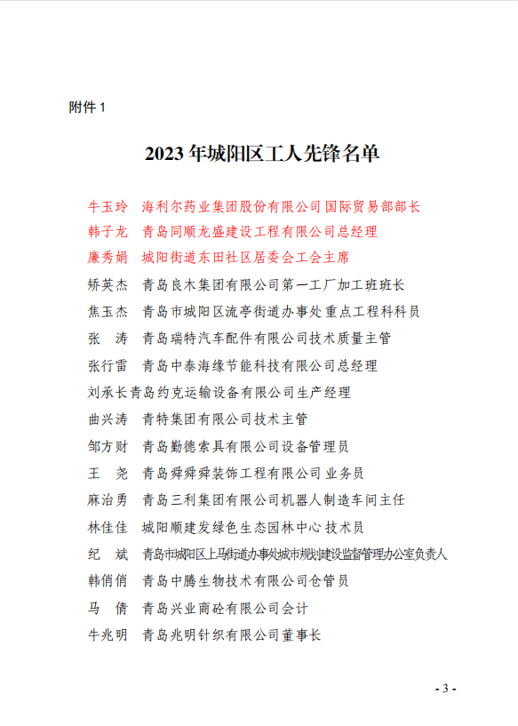 ? ? ? ?在“五一”國際勞動節來臨之際,為學習先進、樹立榜樣,進一步激發全區職工干事創業、爭先創優積極性,城陽區總工會公布了2023年城陽區工人先鋒、工人先鋒號名單,海利爾藥業集團國際貿易部部長牛玉玲等30名“城陽區工人先鋒”受到表彰。