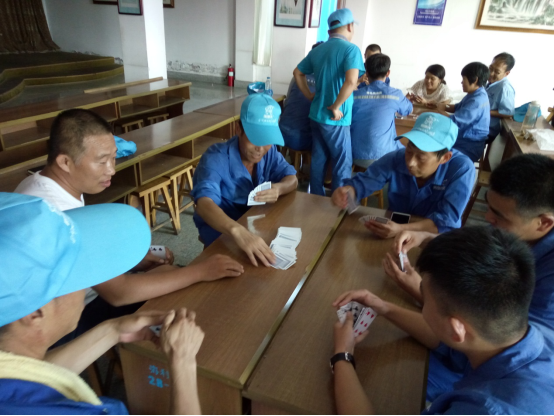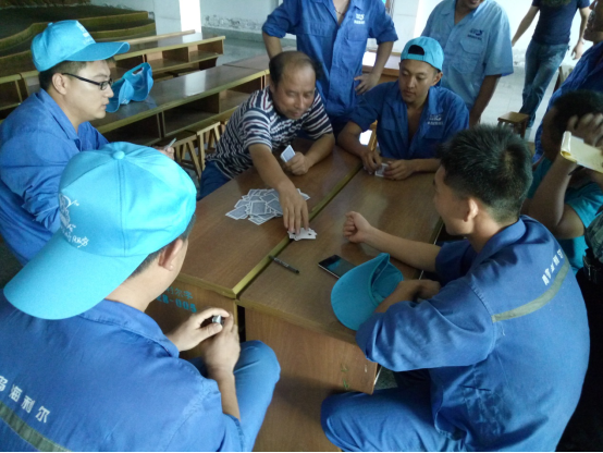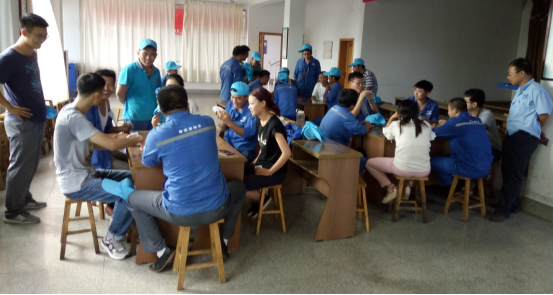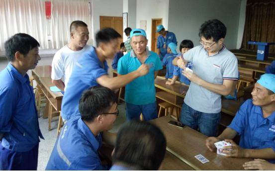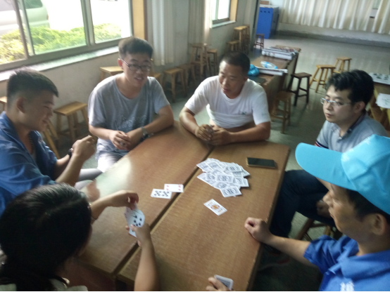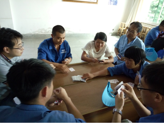 務實隊&正直隊最先結束對抗,正直隊勝出,他們的表情也非常輕松,看來早已是勝券在握啊。誠信隊&超越隊在比賽過程中就比賽規則有一些小爭執,我們看到裁判員已經在進行調節。比賽繼續進行,超越隊勝出。坦誠隊&感恩隊在比賽的尾聲出現了逆轉,原本感恩隊的陳雷、陳雅雯想悶掉坦誠隊的原廠長,但無奈原廠長變換了出牌方式,以致對方無法實施原計劃戰術,最后坦誠隊勝出。在陽光隊&服務隊的對抗中,實力雄厚的陽光隊也輕松勝出。