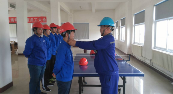 二車間主任劉春輝為新員工佩戴安全帽